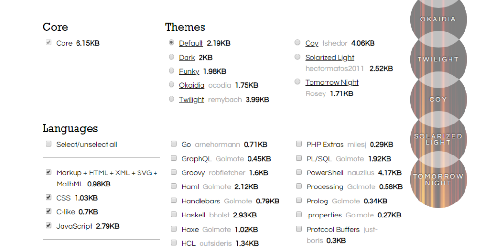 Prism.js支持很多种语言和插件主题。把一些不必要支持的语言包下载下来,会加大库文件大小,拖累我们网站加载速度。所以Prism.js采用自定义下载。